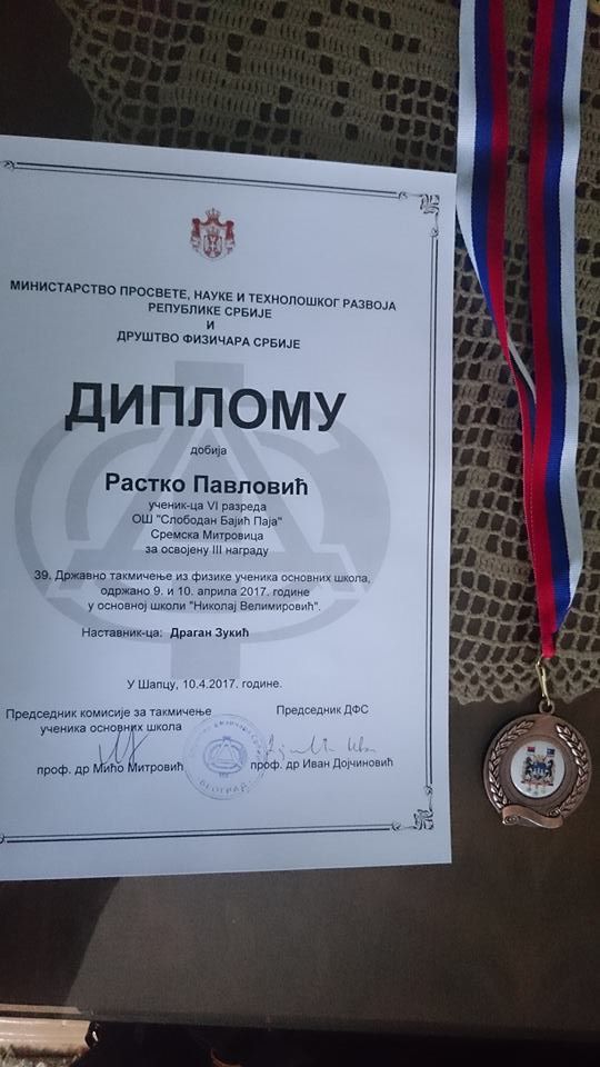 Ученик наше школе Растко Павловић је освојио треће место на 39. Државном такмичењу из физике. Такмичење је одржано у Шапцу 9.4.2017. године, а учествовало је 200 ученика. Тако је наш град постао богатији за још једног младог физичара, а школа и наставници поносни на свог ђака.