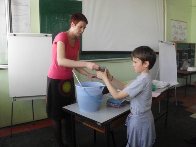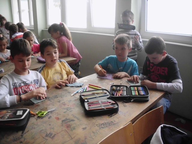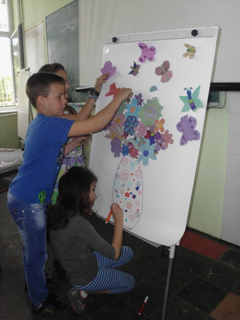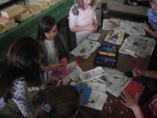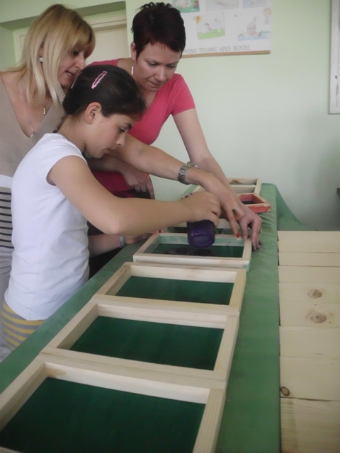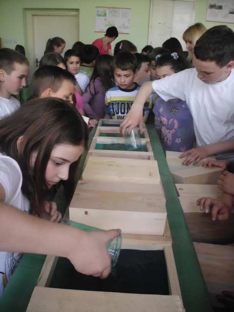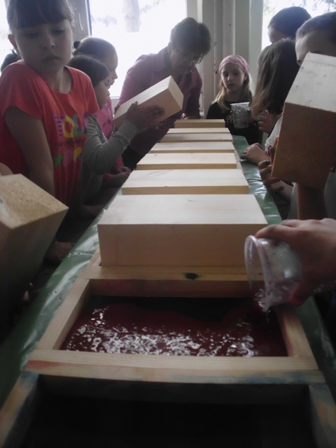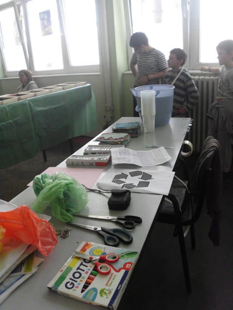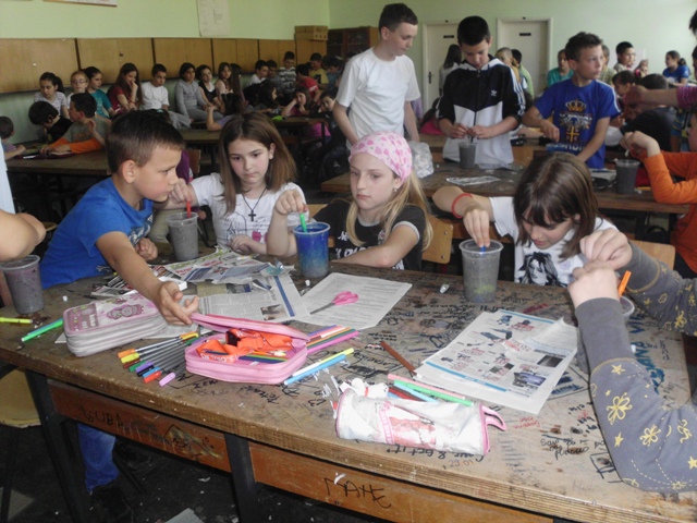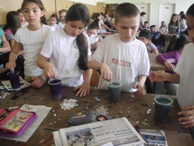 Ученици су прошли кроз све фазе рециклаже папира. Прво су сецкали папир на што ситније комаде, онда су све скупили и потопили у воду. Тако омекшан папир се уситни блендером или сецком и добије се ситнија маса погодна за даљу рециклажу. Ова маса је припремљена раније да би ученици прошли кроз цео процес рециклаже папира. Ученици су добили по чашу ове уситњене масе да је обоје са темпером у боју коју желе и да разлију у дрвене рамове формата А4. Када су разлили масу, да би се боље оцедило и осушило, притисли су комадом дрвета. Тако разливен папир оставили су да се суши неколико дана а од раније направљеног папира ученици су добили задатак да направе вазу са цвећем и лептире.